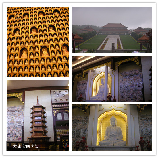 大门正对着富丽堂皇的观音殿,观音殿正中的千手观音像用整块汉白玉雕刻而成,配以描金,背景为石刻的大悲咒,四周为近万座石窟造型的佛龛,内里放置观音雕像,天花板为叠层圆形吊顶,整个观音殿气势恢宏,令人赞叹!