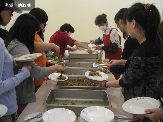 大雄宝殿两侧的东禅楼、西净楼是免费提供喝茶、看书的地方,在斋堂大觉寺提供免费的素斋。用餐前有义工专门和大家宣导,过堂饭讲究用饭时安静,不得讲话,添加饭菜都是以手势示意,不得剩下饭菜,因为许多人为了这顿饭菜都花了不少血汗,所以不能浪费,要以感恩的心用膳。当大家走入整齐的斋堂,看到摆放整整齐齐的桌椅和餐具时,都不由得变得更为自律,静下心来,静静品味斋饭质朴无华的原味。