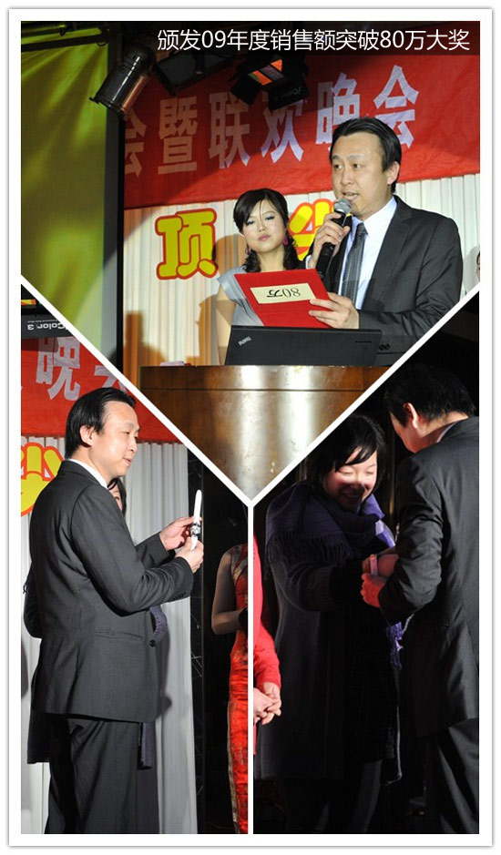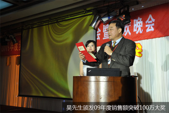 “谢谢大家09年做出的努力,取得如此好的成绩,感谢大家!感谢每一位伙伴!当然,也绝不能忘了感谢客户,是客户对我们的信任和支持,才会购买我们的产品,让我们09年打了漂亮的一仗!”吴先生在台上声情并茂的说着。