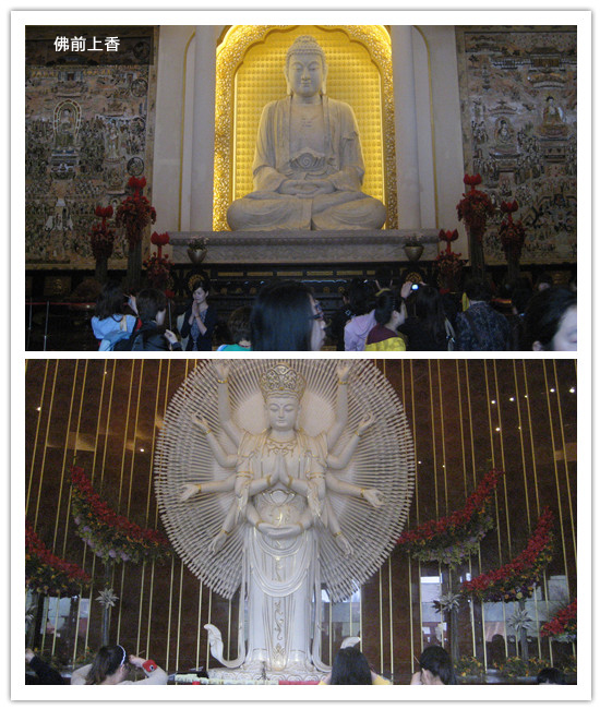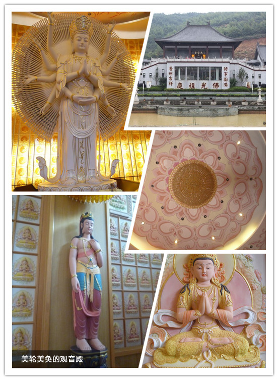 大门正对着富丽堂皇的观音殿,观音殿正中的千手观音像用整块汉白玉雕刻而成,配以描金,背景为石刻的大悲咒,四周为近万座石窟造型的佛龛,内里放置观音雕像,天花板为叠层圆形吊顶,整个观音殿气势恢宏,令人赞叹!