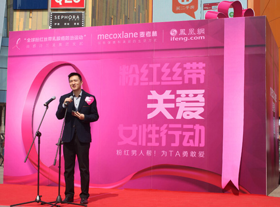 紧接着的是凤凰网华东区总经理吴剑先生发言。他表示自己也深有感触,身边的女性同事承受了很多来自工作和生活上的压力。所以这次与麦考林共同策划了“粉红男人帮”活动,就是希望改变原本以女性群体作为主导的传统思维,让男人加入进来,以实际行动为女性健康出一份力,非常有意义。